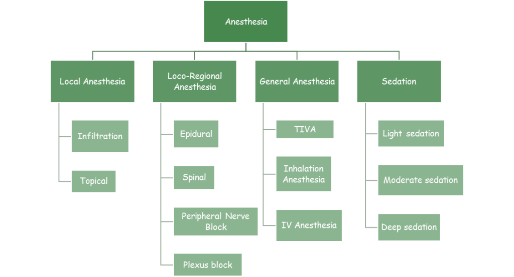 – General Anesthesia: Induces a state of unconsciousness and is used for procedures that require the patient to be fully asleep.