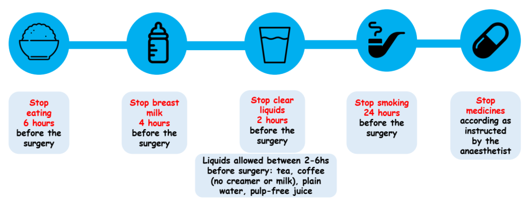 – Fasting: Follow instructions on when to stop eating and drinking before the procedure: typically 6-8 hours prior the surgery (6 hours for light meals, 8h for heavy meals, 2 hours for clear liquids without milk or pulp).